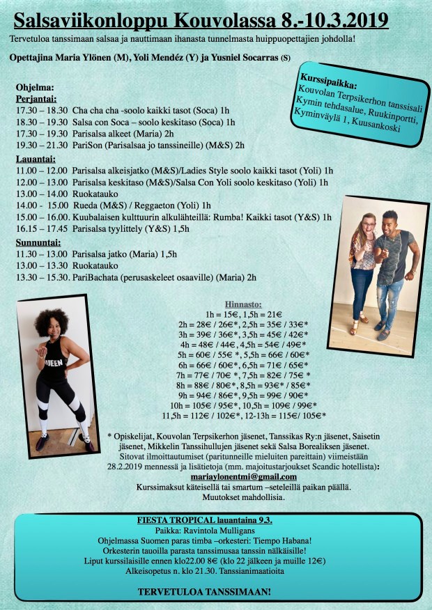 Tervetuloa tanssimaan salsaa ja nauttimaan ihanasta tunnelmasta huippuopettajien johdolla! Opettajina Maria Ylönen (M), Yoli Mendéz (Y) ja Yusniel Socarras (S)