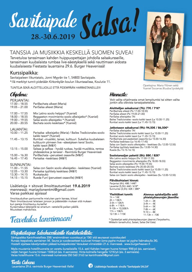 Tervetuloa tanssimaan kahden huippuopettajan johdolla salsakursseille sekä tutustumaan kuubalaiseen rumbaan niin musiikkina kuin tanssinakin live –rumpusäestyksen siivittämänä! Lisäksi lauantaina nautimme kuubalaisesta iltamista kuubalaisen ruoan sekä tietysti musiikin siivittämänä ravintola Burger Heavenissä! Terpsikerhon jäsenille alennus hinnoista!
