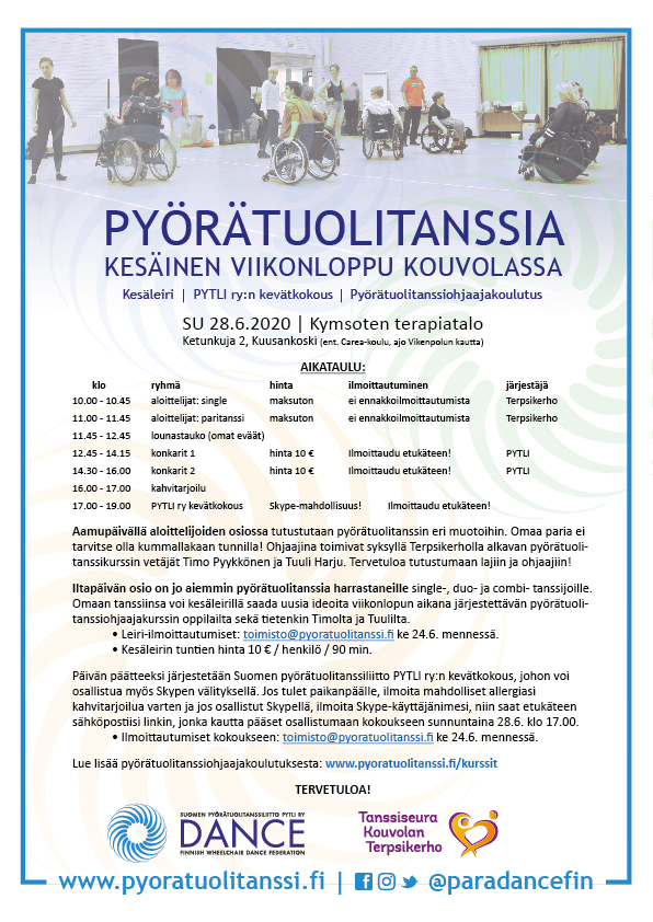Terpsikerho järjestää pyörätuolitanssin koulutus- ja leiriviikonloppuun maksuttoman tutustumismahdollisuuden pyörätuolitanssista kiinnostuneille henkilöille. Aamupäivällä su 28.6. aloittelijoiden osiossa tutustutaan pyörätuolitanssin eri muotoihin. 45 min opetushetkissä Single-tanssijat aloittavat klo 10 ja paritanssijat klo 11. Saavu siis vaan paikalle – ei ennakko ilmoittautumista. Omaa paria ei tarvitse olla kummallakaan tunnilla!
