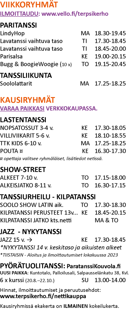 - Lisätiedot kausiryhmistä ja kurssimaksut tehdään verkkokaupassa osoitteessa www.terpsikerho.mycashflow.fi