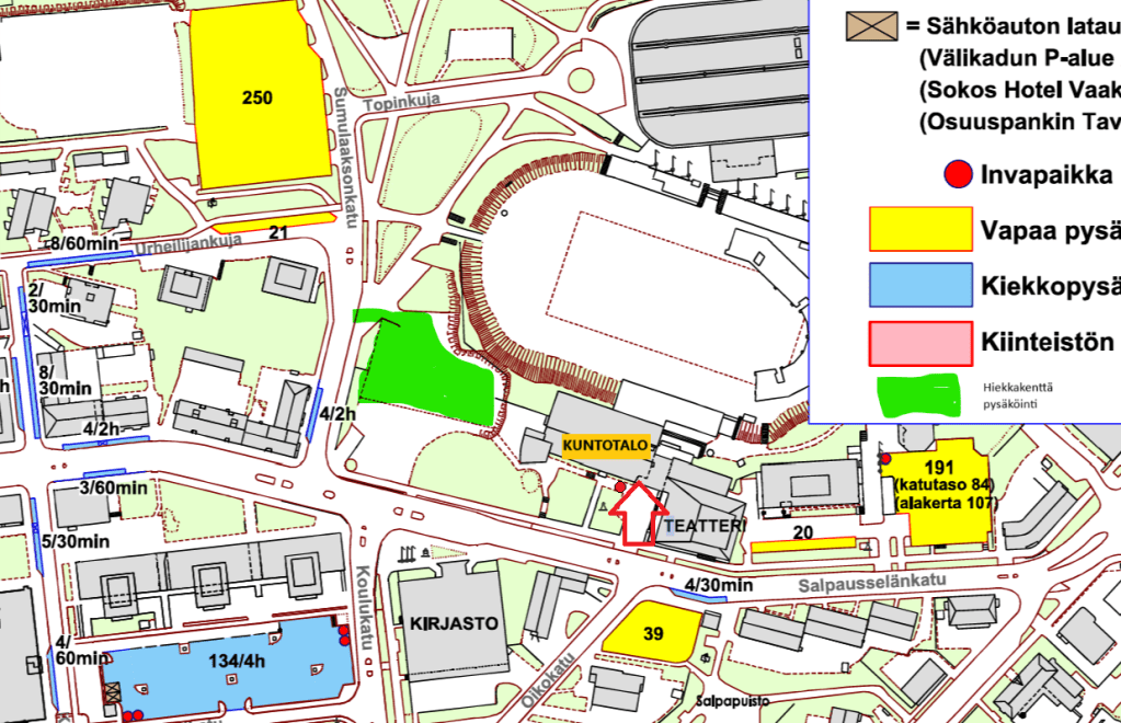 Huomioithan, että kisapäivänä on lähistöllä Kouvolan Teatterilla näytökset klo 13 ja 18 sekä jäähallilla (harmaa soikiorakennus kartan yläosassa) on KooKoo-Pelicans kotiottelu klo 17, jotka aiheuttavat ruuhkaa parkkialueilla. Pysäköintikartan lähde: https://www.kouvola.fi/wp-content/uploads/2023/02/kouvolan_ja_kuusankosken_pysakointialueet_240223.pdf
