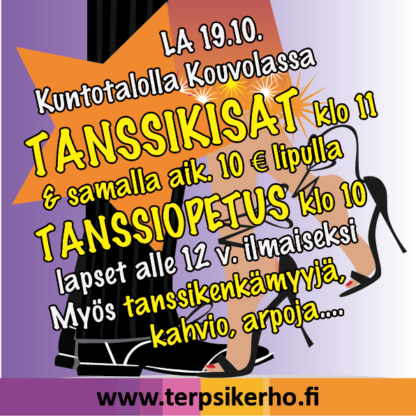 - kannustamaan kilpatanssijoita lapsista senioreihin upeisiin suorituksiin Kuntotalolla Kouvolassa klo 11:00 alkaen. Kouvolan Terpsikerhosta on mukana seitsemän taitavaa tanssiparia: