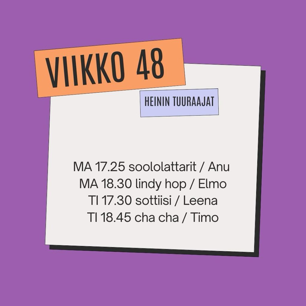 Viikon 48 ohjaajamuutokset 26.11.202426.11.2024 Viikon 48 ohjaajamuutokset: Anu pitää maanantain soololattarit ja Elmo lindy hopin, Leena ja Timo tiistain lavatanssitunnit.