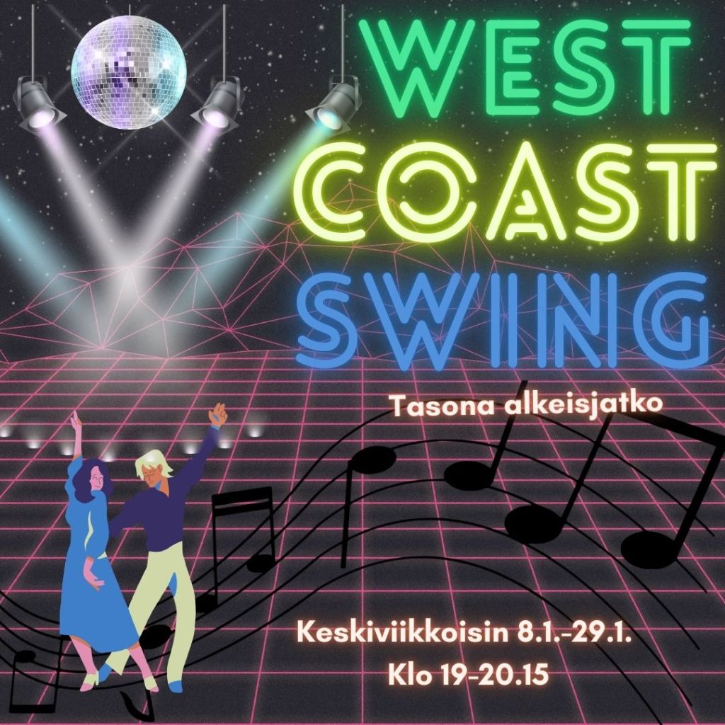 West Coast Swing -tunnit jatkuvat tammikuussa keskiviikkoisin 8.1.-29.1. klo 19-20.15. Tasona alkeisjatko, joten olethan tanssinut lajia aiemmin (syksyn tuntien kokemus riittää). Ohjaajana toimii Mira Hinkkanen
