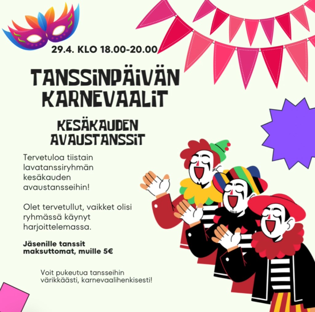 Kansainvälistä tanssin päivää vietetään vuosittain ympäri maailmaa 29.4. 💎 Tänä vuonna tiistain lavatanssiryhmä pääsee nauttimaan kyseisenä päivänä kesäkauden avajaistansseista salillamme klo 17.45-20.00. Olet tervetullut ”tanssikarnevaaleille”, vaikket olisi käynyt lavatanssiryhmissämme. 🙂 Nämä ovat matalan kynnyksen tanssit, joihin on tervetulleita kaikki. ☀️