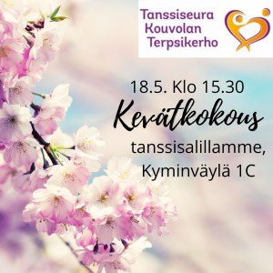 Tanssiseura Kouvolan Terpsikerho ry:n kevätkokous pidetään tanssisalillamme (Kyminväylä 1C) sunnuntaina 18.5. klo 15.30. Käsittelemme sääntömääräiset asiat, tervetuloa!