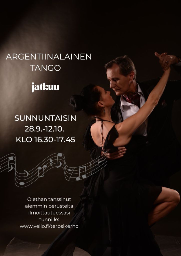 Alkusyksyn lavatanssitunneilla saatiin kolmen viikon maistiainen argentiinalaisesta tangosta. Tunnit olivat suosittuja, joten laitetaan niille jatkotunnit: sunnuntaisin 28.9.-12.10. Klo 16.30-17.45!