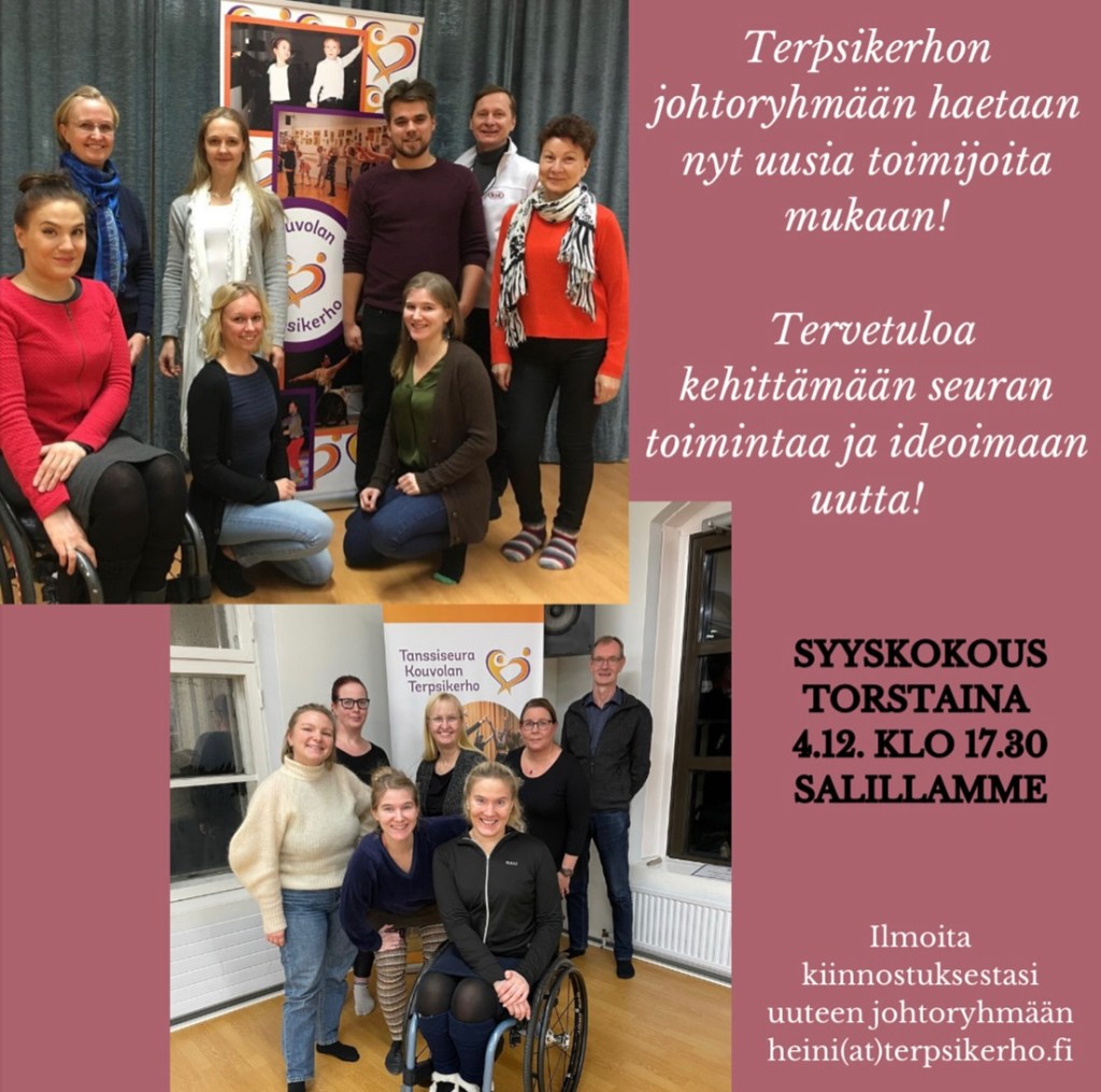 Tervetuloa mukaan ideoimaan uutta sekä vaikuttamaan seuran toimintaan! Mikäli olisit kiinnostunut olemaan osa tiimiä, laittele viestiä heini(at)terpsikerho.fi