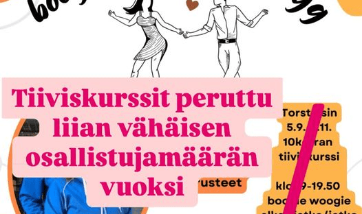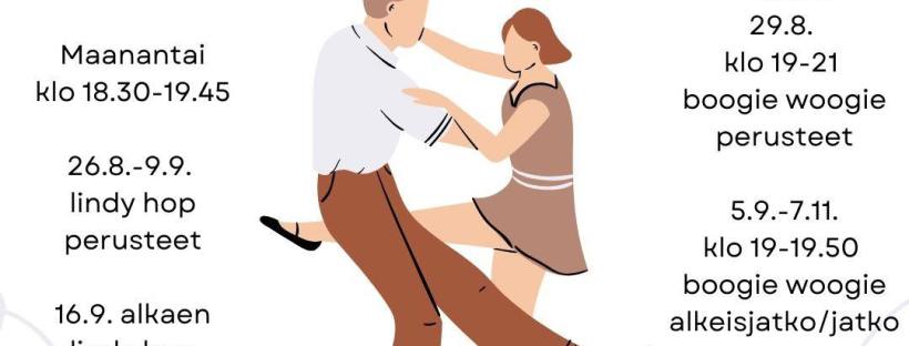 Valitettavasti 5.9.-7.11. Liljojen torstain boogie woogie ja bugg -tiiviskurssit peruutetaan liian vähäisen osallistujamäärän vuoksi. Ilmoittautuneille on lähetetty asiasta sähköpostia.